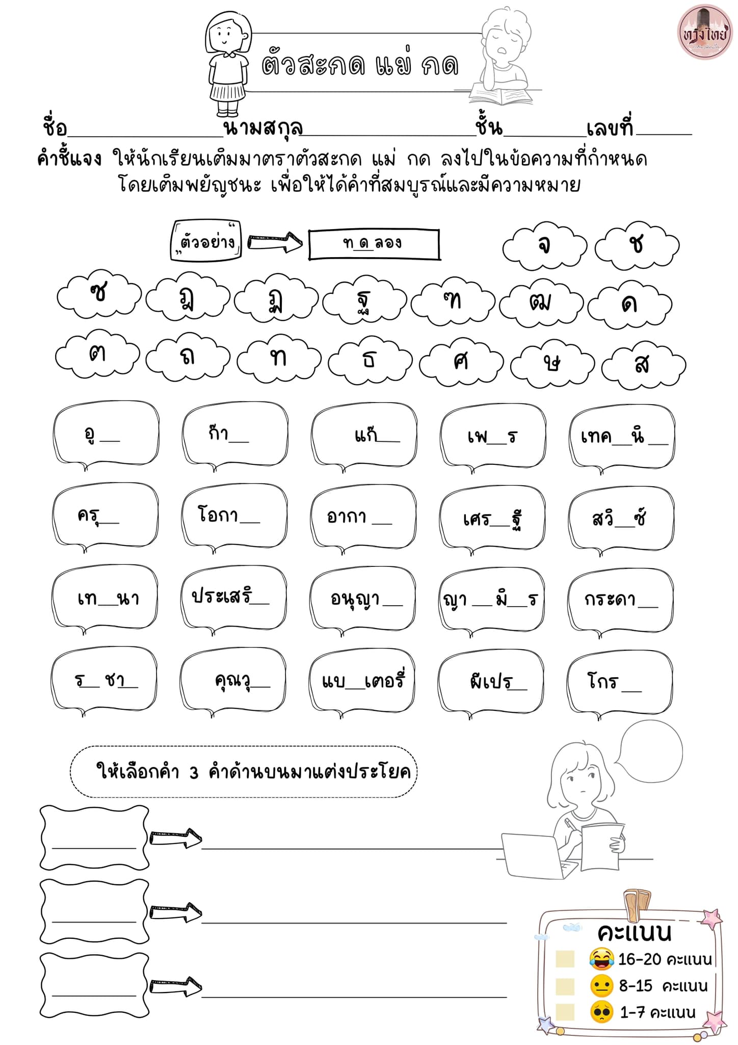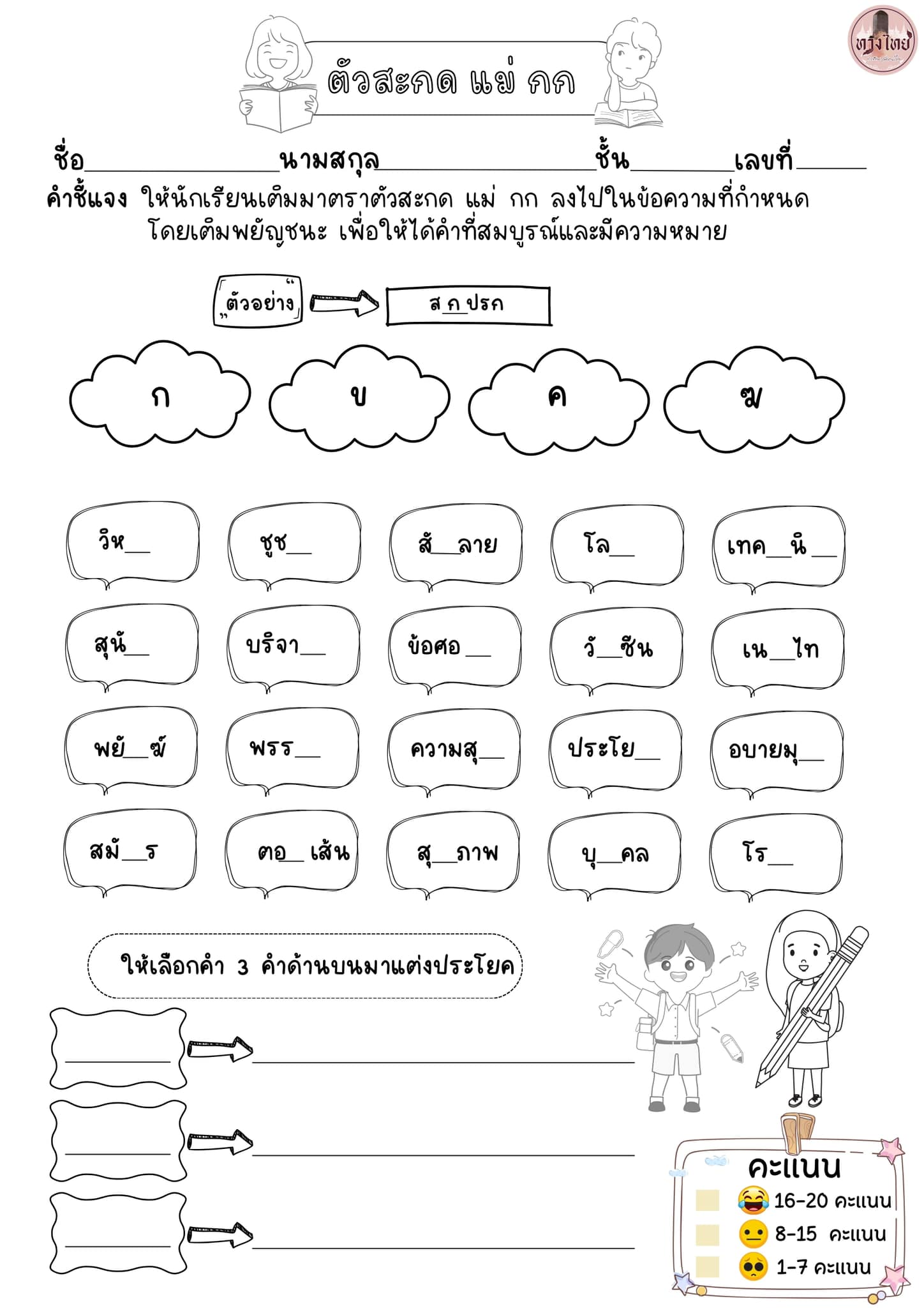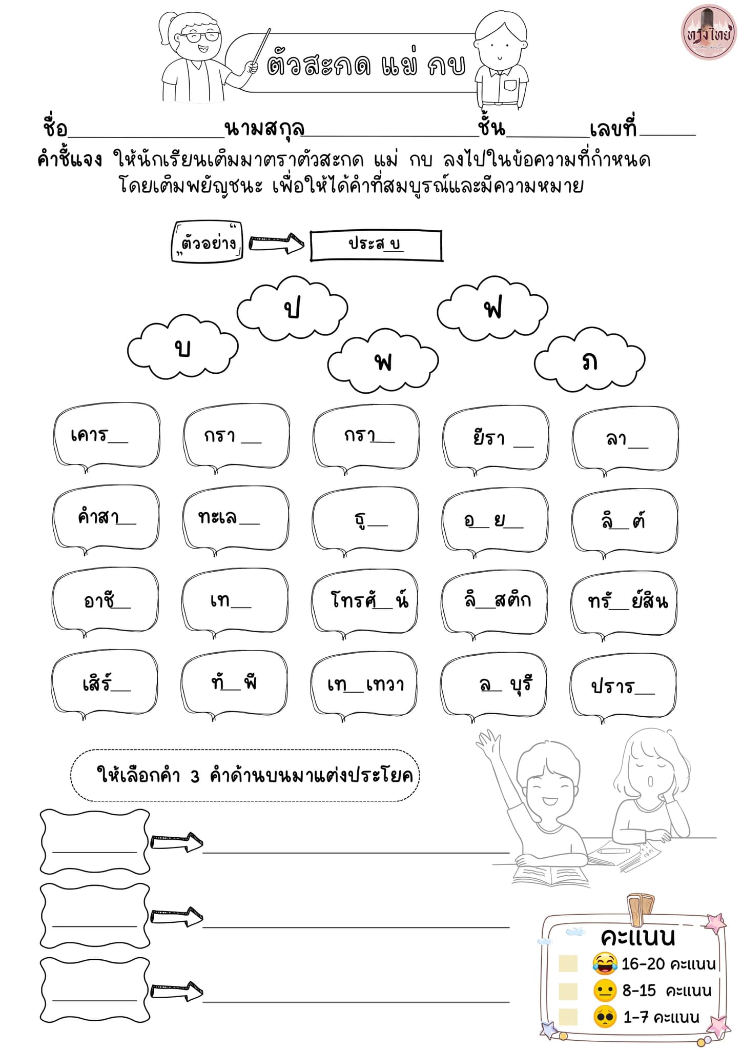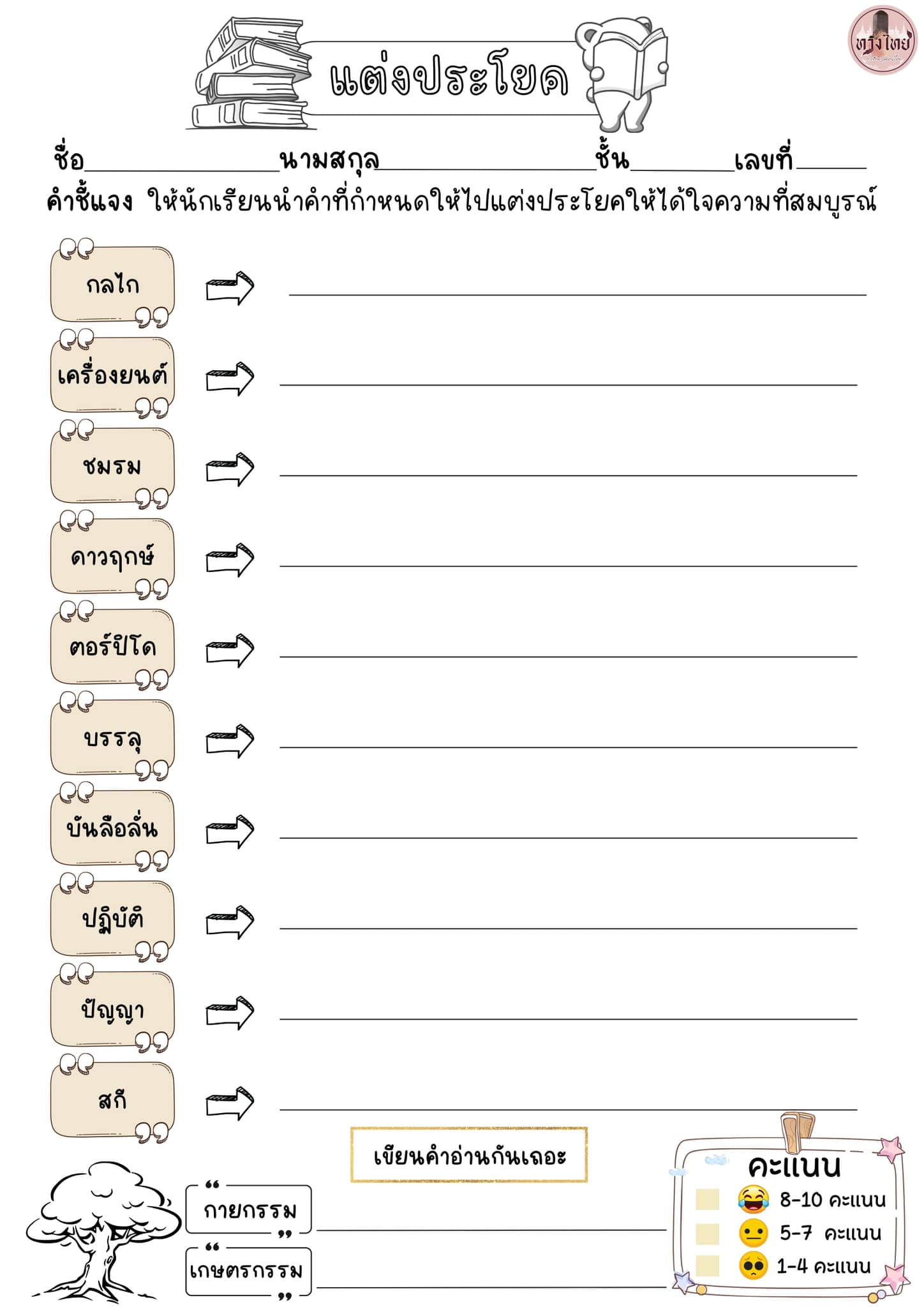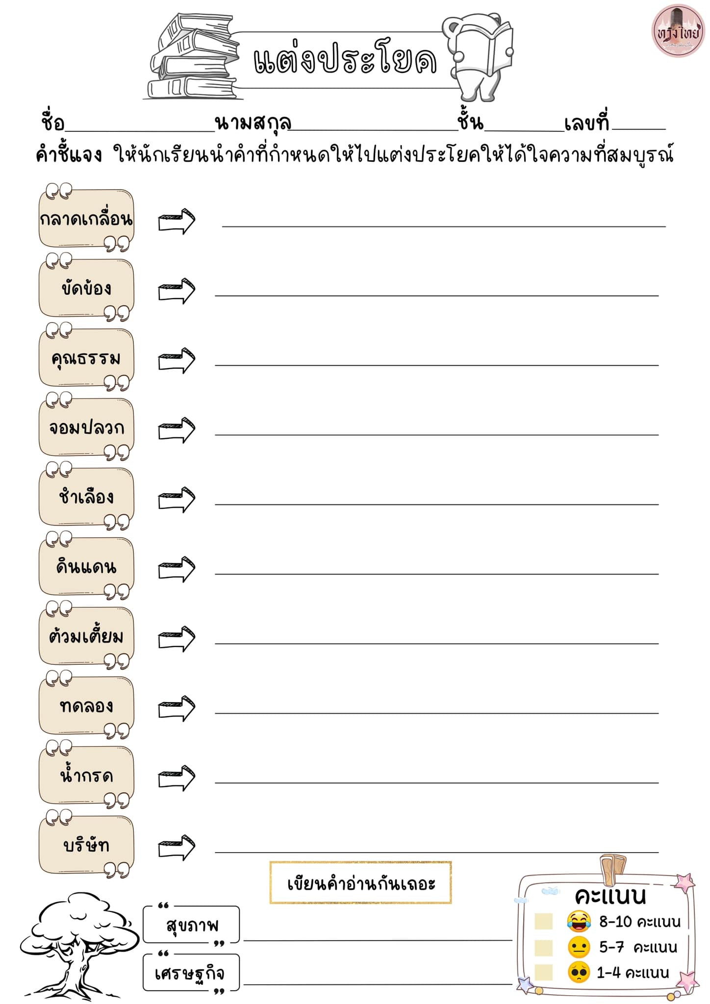 ทั้ง ใบงานคำคล้องจอง คำควบกล้ำ เรื่องของคำเเละความหมาย ใบงานเรื่องการเเต่งประโยค การเรียบเรียงคำ ตัวสะกด เเม่ กก / เเม่ กด / เเม่ กน / เเม่ กบ และอื่น ๆ