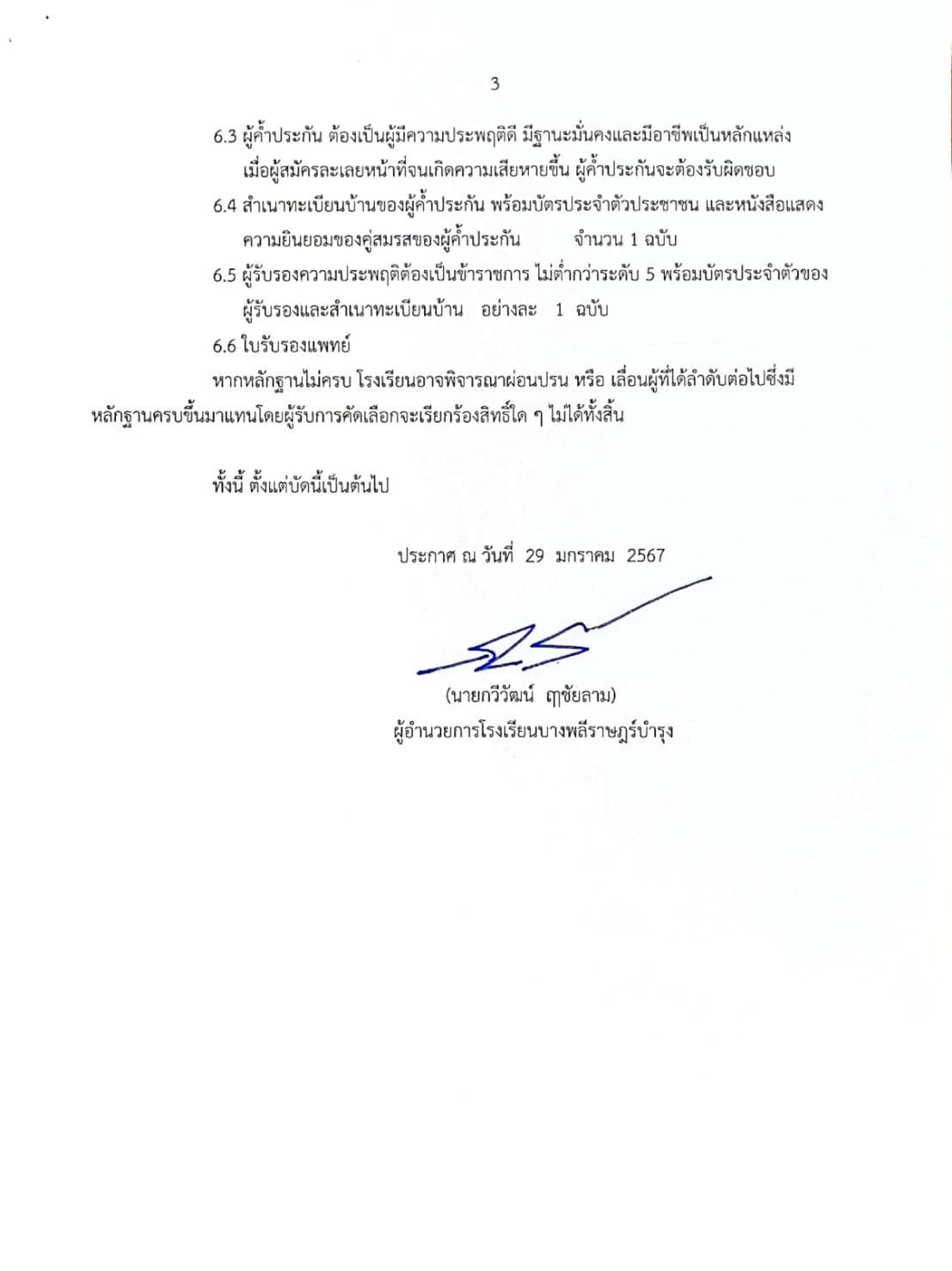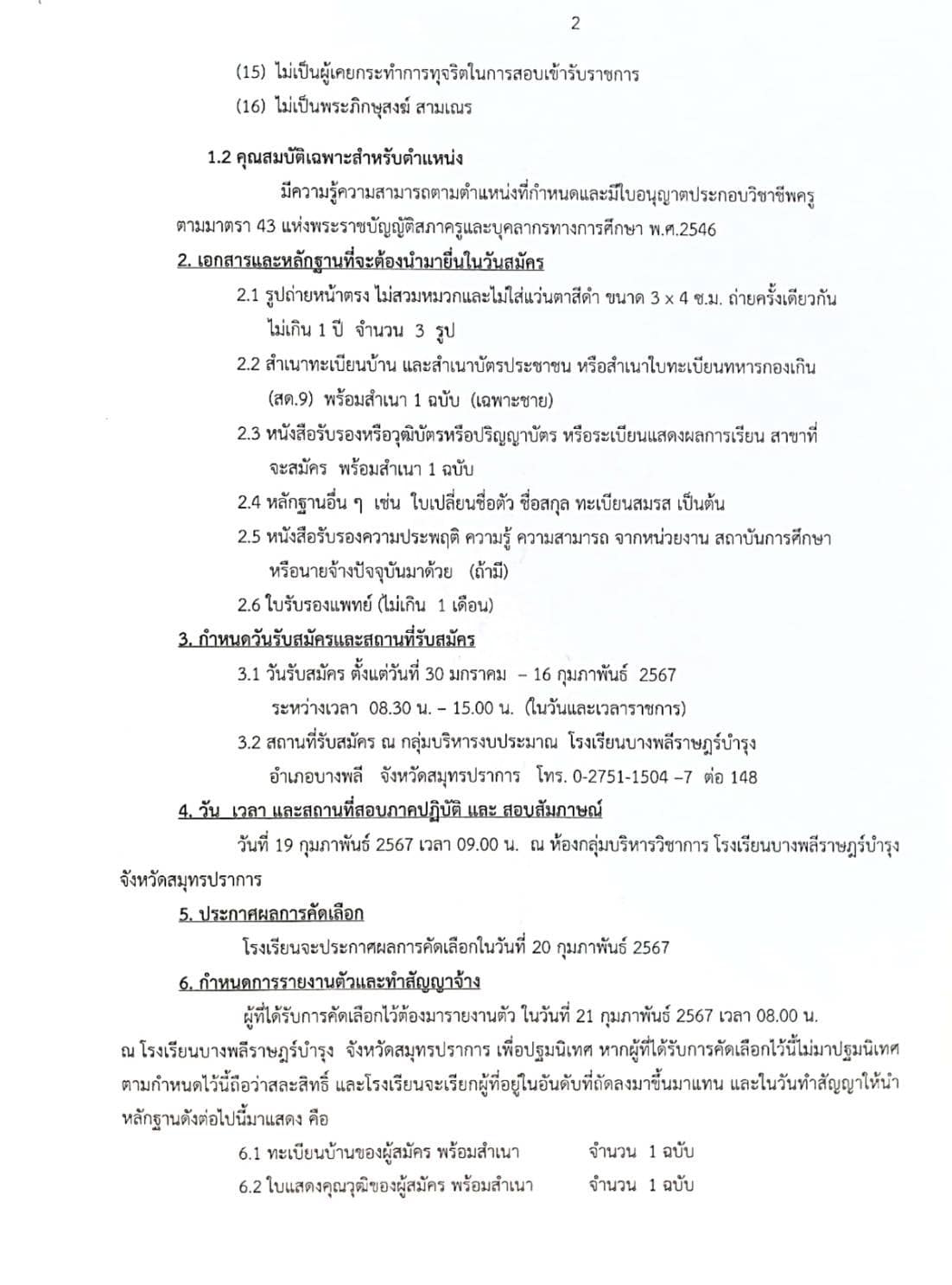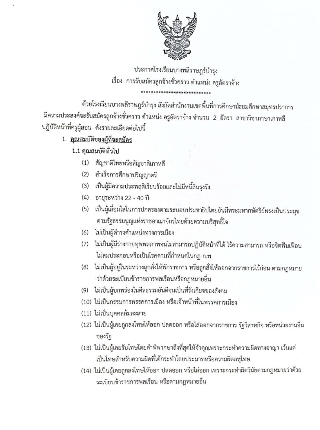 ประกาศโรงเรียนบางพลีราษฎร์บำรุง สังกัดสำนักงานเขตพื้นที่การศึกษามัธยมศึกษาสมุทรปราการ รับสมัครลูกจ้างชั่วคราว ตำแหน่ง ครูอัตราจ้าง 2 อัตรา สาขาวิชาภาษาเกาหลี ตั้งเเต่วันนี้ จนถึงวันที่ 16 กุมภาพันธ์ 2567