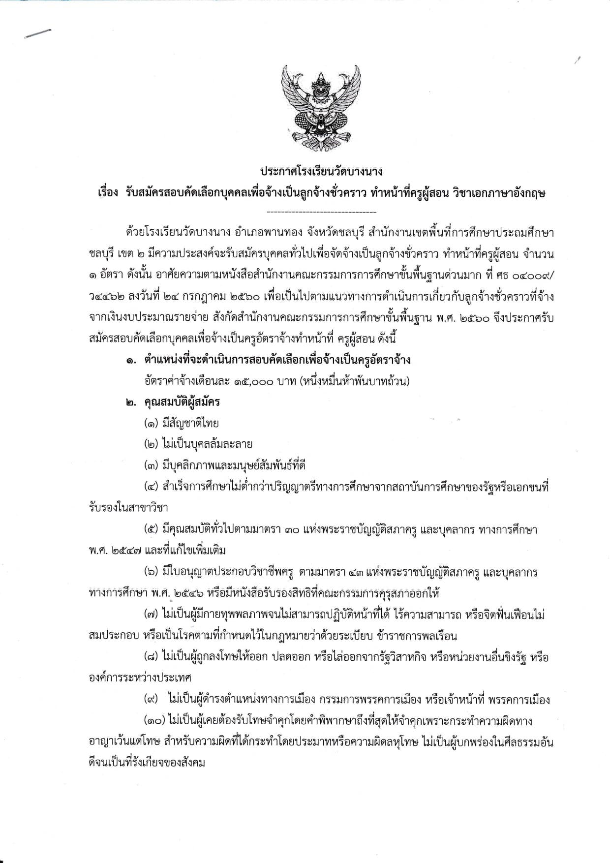 โรงเรียนวัดบางนาง (ขยายเวลาการรับสมัคร) ครูอัตราจ้าง วิชาภาษาอังกฤษ จำนวน 1 อัตรา เงินเดือน 15,000 บาท