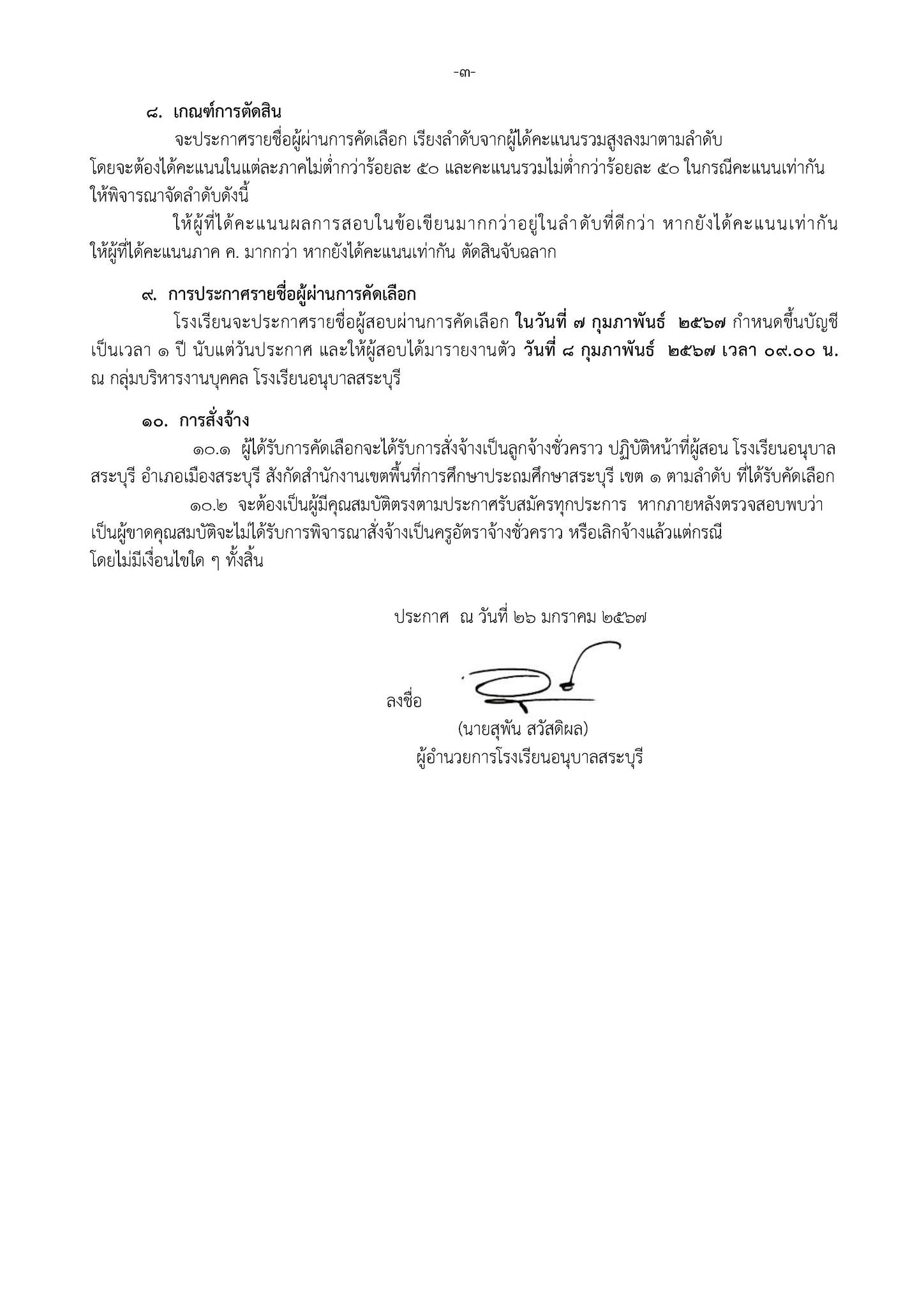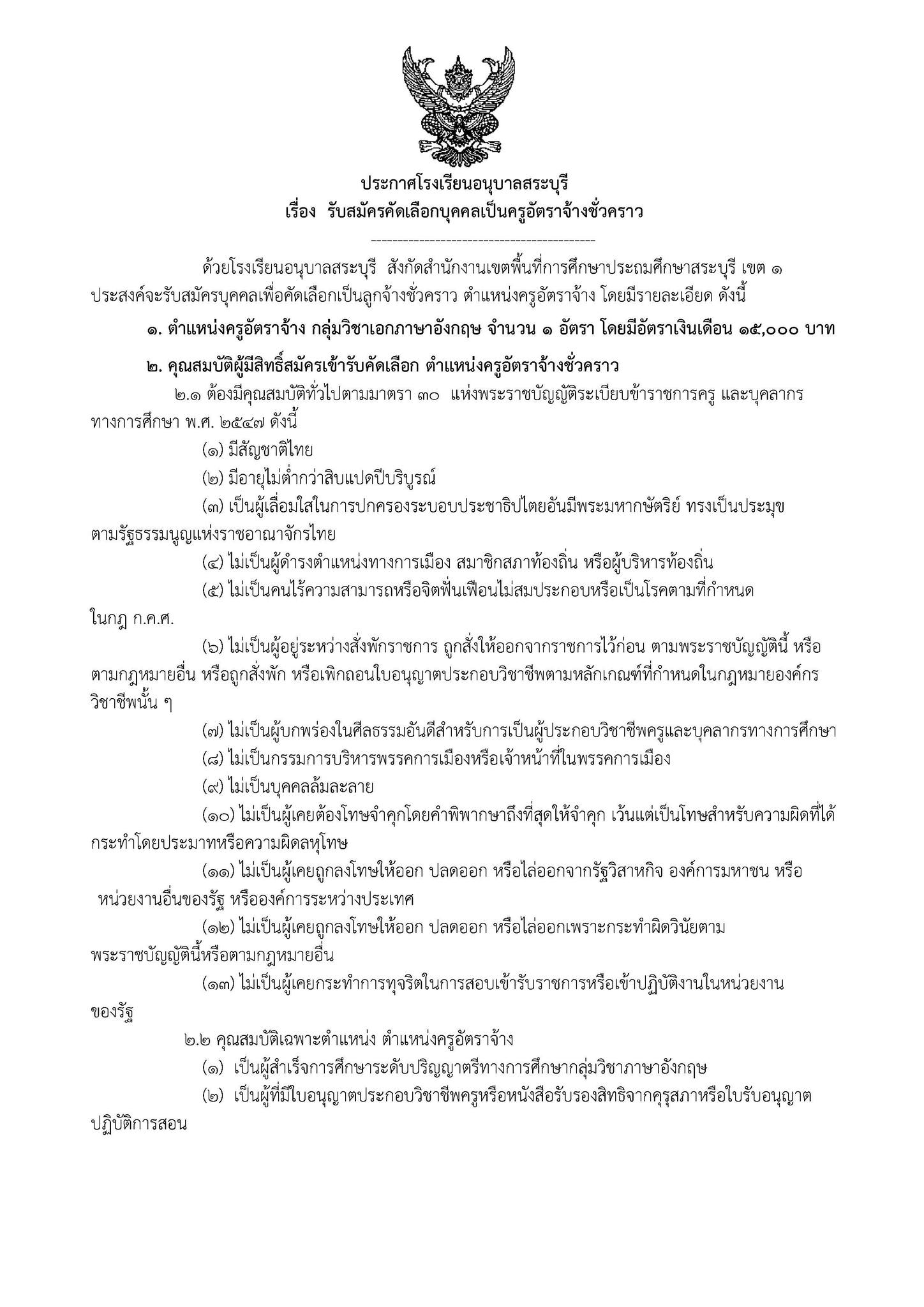 ด้วยโรงเรียนอนุบาลสระบุรี สังกัดสำนักงานเขตพื้นที่การศึกษาประถมศึกษาสระบุรี เขต 1 ประสงค์จะรับสมัครบุคคลเพื่อคัดเลือกเป็นลูกจ้างชั่วคราว ตำแหน่งครูอัตราจ้าง โดยมีรายละเอียด ดังนี้ ตำแหน่งครูอัตราจ้าง กลุ่มวิชาเอกภาษาอังกฤษ จำนวน 1 อัตรา โดยมีอัตราเงินเดือน 15,000 บาท